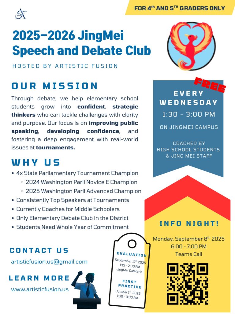 We are excited to start the debate club at JingMei elementary school in the fall. Look forward to meeting the students and help them grow with debate and policy research